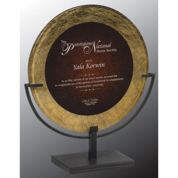 13 3/4” Gold/Burgundy Round Acrylic Art Plaque with Iron Stand
