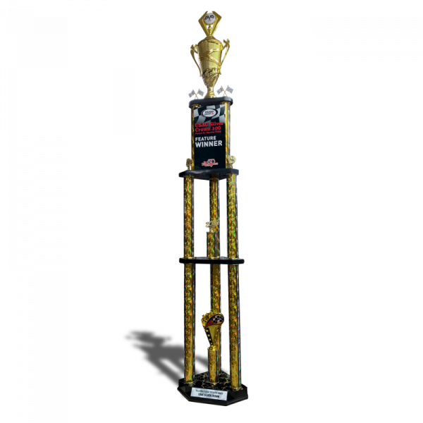 Trophies can be customized based upon your activity/sport which will be selected under the topper detail and color. Triple Column Trophies only come with a round column. With this type of trophy, you can select any figure or trim piece(s) to be added to the top, along with a trophy cup. There will be 3 trim pieces to hold the column in place. There is an additional space at the bottom for an additional figure or trim piece. Trophies start at 36″+ tall and can be built to suit, generally topping off at the height of 6-7ft.
