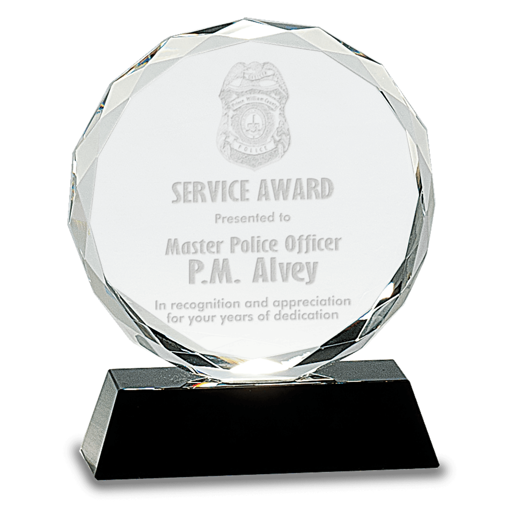 Our Premier Crystal Awards are handmade and may vary slightly in size. Round facet optic crystal piece attached to blue pedestal base. Packaged individually in a lined gift box. Premier Crystal is the ultimate way to recognize and honor!